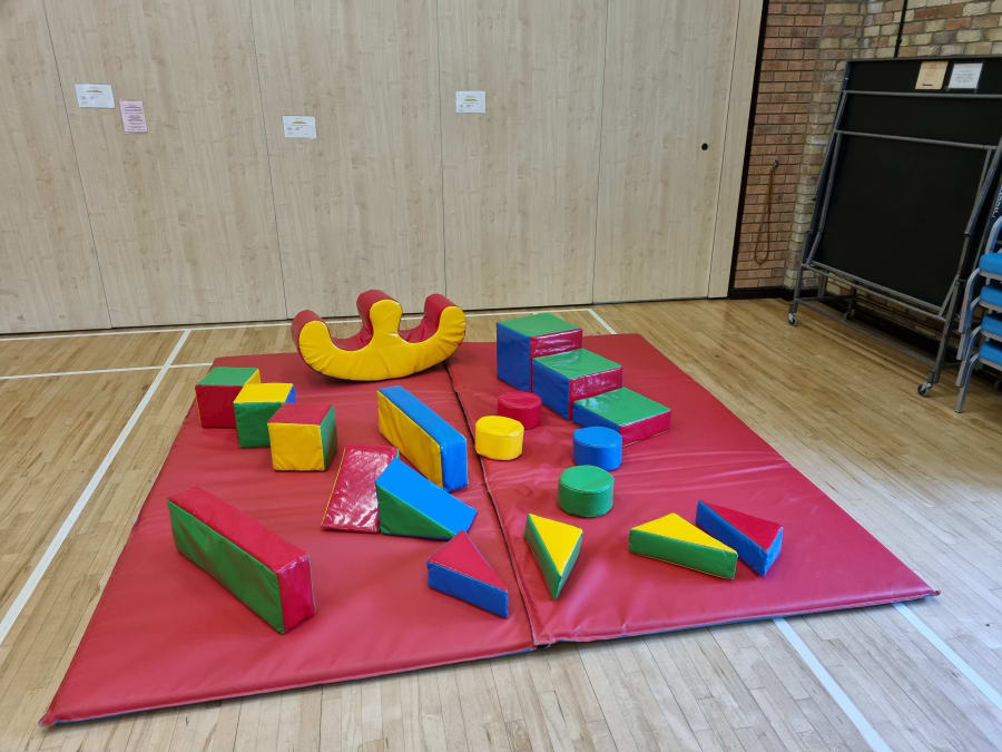 Numerous blocks and shapes, soft play Step'N'Slide and twin seat rocker. All sitting on a 10x10ft play mat.